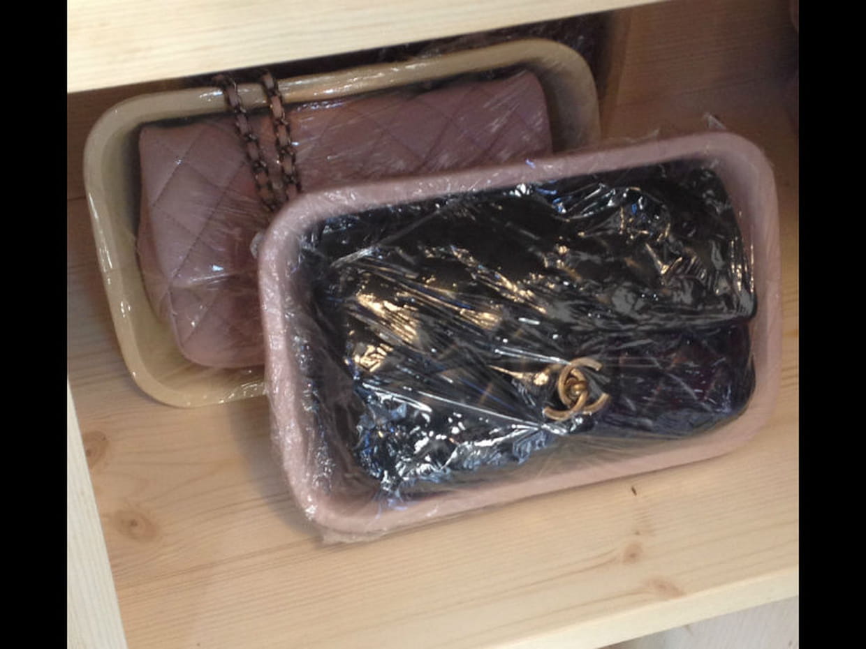 Les sacs matelassés de la collection Chanel prêt-à-porter automne-hiver 2014-2015, présentés sous cellophane.