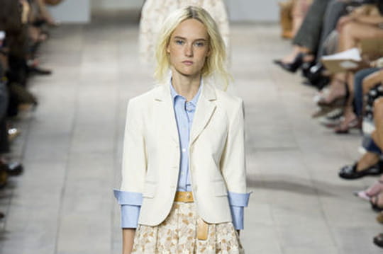 Un peu d'optimisme chez Michael Kors, et un optimisme chic s'il vous plaît ! "Je voulais penser à une période optimiste, aux années 50, à l'après-guerre" confie le créateur. Celui-ci nous offre pour le printemps-été 2015 une collection à la fois romantique et résolument moderne, un mariage entre un héritage féminin des fifties et des réflexes mode résolument moderne. Ainsi les chaussures plates permettent d'accomplir un marathon quotidien sans perdre en élégance et la jupe ultra-féminine se porte avec la chemise piquée à son homme. Le défilé s'ouvre sur une série de modèles immaculés pour donner le ton d'une collection qui se porte et se vit facilement. Les fleurs s'invitent vite et s'épanouissent aussi bien sur une combinaison-pantalon en touches délicates qu'en version plus imposante sur une robe. Brodées, elles viennent donner du volume aux jupes aériennes et si bucoliques. Le vestiaire Kors se fait aussi parfois masculin-féminin comme pour s'ancrer dans la réalité d'une vie active qui ne doit pas nous obliger à renoncer à l'élégance. La marinière s'acoquine avec une jupe quand le pantalon en toile se féminise avec une blouse légère. Les tailleurs font bien sûr référence à cette époque fifties avec des manches trois-quarts mais hésitent pour la longueur des jupes entre une version midi très sage et une forme plus courte et donc plus audacieuse. Mais on préfère encore sa version moderne qui associe une jupe midi à un blazer et une chemise d'homme : chic, sophistiquée et ultra-désirable. La ceinture prend une place toute particulière pour mieux structurer la silhouette, parfois nouée, parfois ornée elle aussi d'une fleur. Les carreaux s'invitent en fin de défilé pour une pause graphique mais toujours ancrée dans l'idée de simplicité. On piquera bien évidemment l'idée de la silhouette associant chemise écossaise et jupe tube fendue qui devrait faire tourner la tête de bien des hommes...