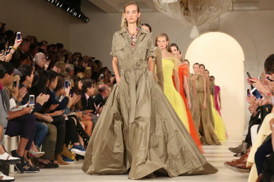 A l'instar de sa consœur Victoria Beckham, Ralph Lauren navigue sur la tendance safari pour le printemps-été 2015. Les mannequins sillonnent les catwalks dans des pantalons cargo kaki ou camel, réchauffés par des sahariennes et des vestons aux tons pourpres, fuchsia et orangés. L'équipement de la femme d'après le créateur américain se compose aussi d'ensembles tailleur kaki dont les vestes, parées de poches plaquées, complètent les jupes cigarette, le tout rehaussé par un chapeau qui aurait fait pâlir Indiana Jones de jalousie. Les chemises abondent et se transforment en robe en daim ou en combi-pantalons satinées. Aussi, l'organza et la soie, matières végétales, cohabitent avec les peaux de serpent et de crocodile. En ressortent des silhouettes parfois monochromes que seules ces différentes matières permettent de nuancer. Et même si les pièces sont parfois issues du vestiaire masculin et que les tons bruns parcourent le podium, les silhouettes restent très féminines : les tailles sont marquées par des ceintures et les jupes longues viennent habiller les exploratrices qui osent s'aventurer la nuit. Ces dernières se transforment alors en princesses des mille et une nuits dans des robes parées d'ornements dorés ou encore dans des robes asymétriques vaporeuses sophistiquées. En somme, Ralph Lauren nous transporte dans des contrées lointaines avec l'esprit safari chic qui émane de sa collection printemps-été 2015. Et il y a fort à parier que ce dernier sera l'une des tendances forte de la saison.