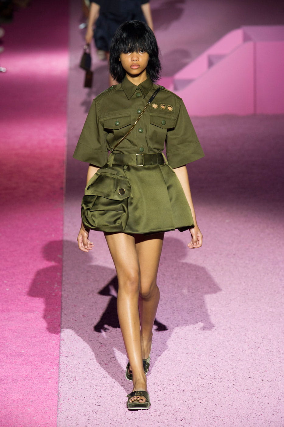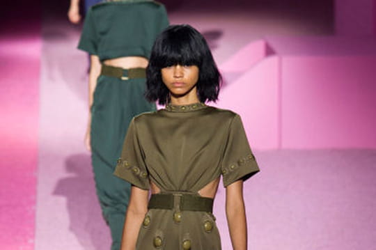 Aux armes fashionista ! La guerre est déclarée pour Marc Jacobs qui déploie une armée très stylée pour sa collection printemps-été 2015. Le créateur impose définitivement, dans le sillage de Ralph Lauren et xxx, le kaki comme l'une des tendances phares de la saison prochaine. La palette graphique impose aussi du bleu marine, un coloris sable ou encore du marron et du noir. Les armes des bons petits soldats du créateur américain emblématique ? Une mode reprenant les codes de l'uniforme mais qui les détourne pour les rendre plus glamour. La veste militaire est revisitée en une robe ceinturée ou en tailleur-jupe. Car le styliste n'oublie pas qu'il compose une garde-robe féminine et place robes et jupes au centre de ce vestiaire aux inspirations plutôt masculines. Les matières, satin au premier rang, viennent appuyer cette envie d'apporter de la douceur dans un univers des plus stricts. L'autre moyen d'arrondir les angles, c'est d'exploiter les sphères et autres cercles sur les pièces qui défilent. Perforées ou au contraire en relief, ces étranges bulles envahissent les tissus comme pour leur apporter une nouvelle dimension. Les poches se plaquent sur les tops ou sur les vestes dans un nouveau format XXL. Comme pour dispenser les femmes d'un sac à main ? En tout cas, cette nouvelle collection surprend, surtout dans son décor de maison de poupée rose qui contraste avec l'esprit du vestiaire imaginé par Marc Jacobs. Une fois de plus, le créateur est là où on ne l'attend pas et nous prouve que malgré son départ de la maison Vuitton, il n'a pas baissé les armes. Bien au contraire...