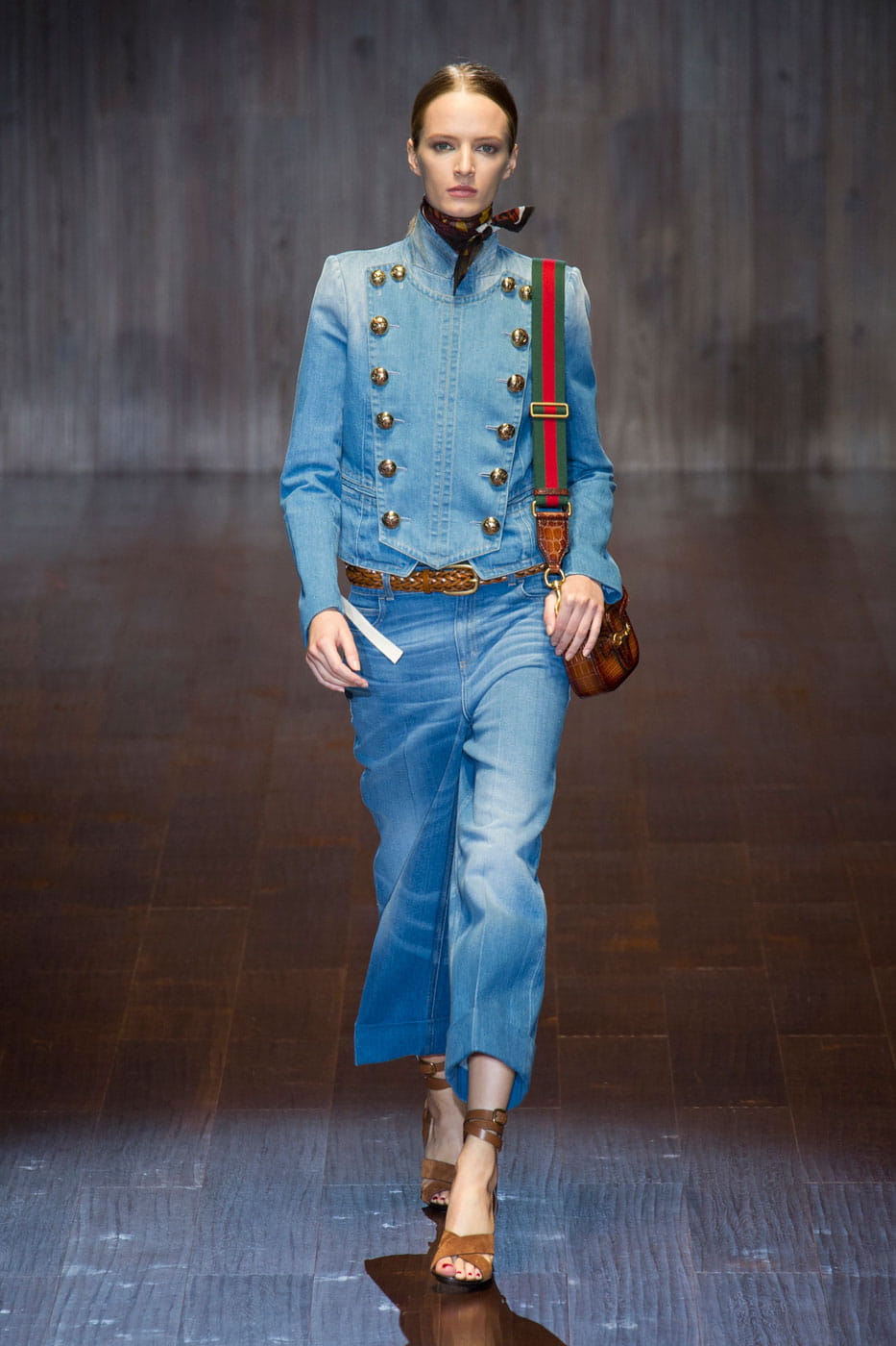 Avec des invitées aussi prestigieuses que Kate Moss, Charlotte Casiraghi et Kate Moss au premier rang, le défilé Gucci se devait d'être à la hauteur. Frida Giannini, la directrice artistique, livre une collection printemps-été 2015 fidèle à son style et ses thèmes d'inspiration privilégiés. Cap donc sur les années 70's, qui vont à merveille à la maison Gucci, avec des jupes-culotte amples, des gilets sans manche en fourrure, des blouses en soie et des robes-chemise. Le jean ample affiche une longueur 7/8e et se porte taille-haute. La créatrice mixe un esprit army-chic très présent avec notamment les vestes à brandebourgs et le kaki qui souligne une rigueur élégante. Mais le défilé s'ouvre sur une vague immaculée pour un résultat épuré qui souligne davantage les accessoires de la marque, du sac à la ceinture en passant par le foulard noué autour du cou. Les silhouettes affichent rapidement deux des tendances fortes de cette fashion week printemps-été 2015 : le daim et le jean. Ce dernier, plus que jamais incontournable, s'orne de détails avec un laçage XXL ou des boutons officiers. Le glamour s'invite avec un coloris cerise ou un rouge plus triomphant. Le défilé s'achève sur une parenthèse exotique qui nous invite à l'évasion avec des robes esprits kimonos et des broderies chinoisantes. Une incitation au voyage pour passer l'hiver avec l'été déjà en tête.