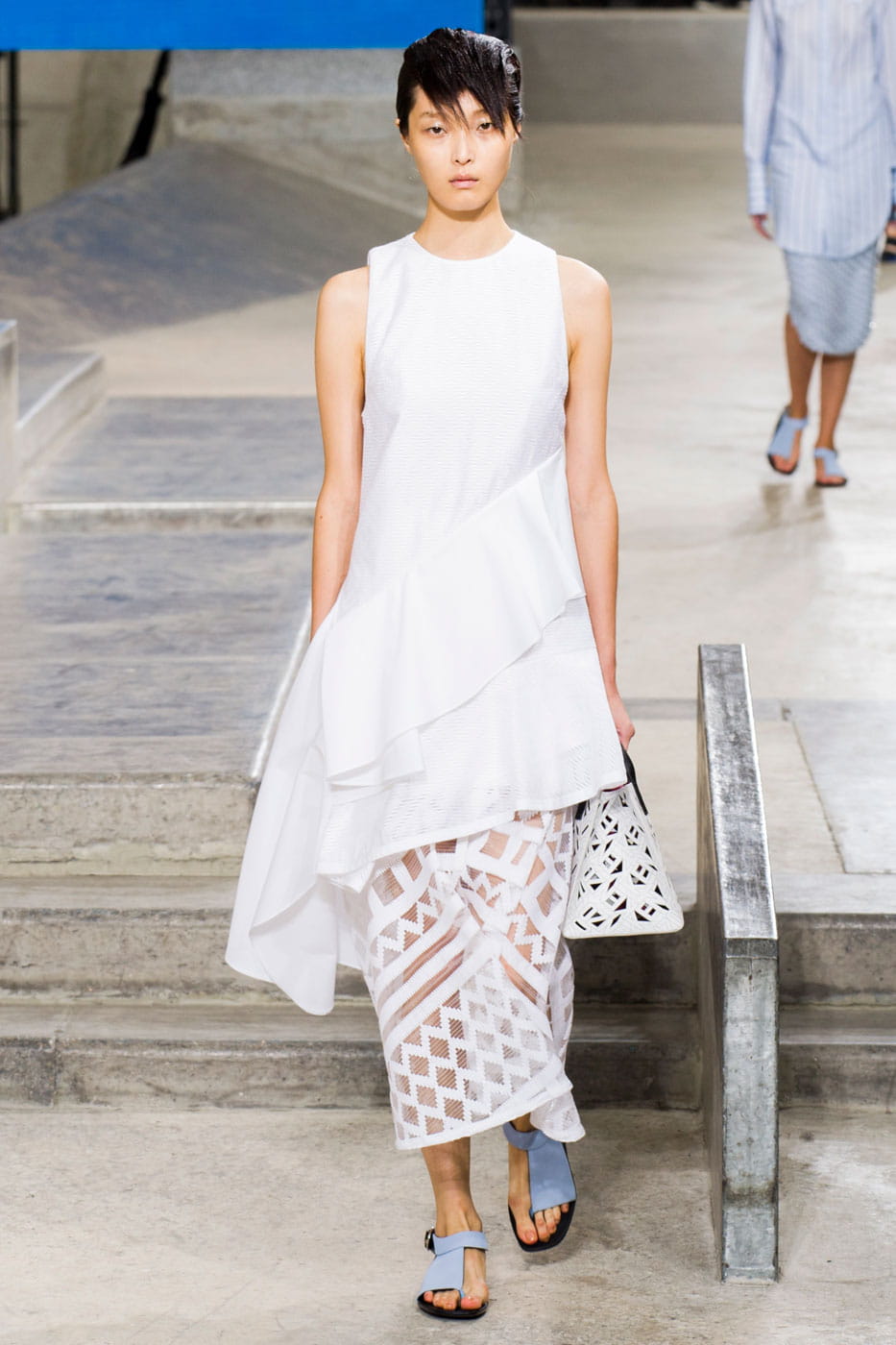 La palette de couleur est douce et harmonieuse : on y trouve l'éternel tandem blanc et noir, mais surtout des nuances de bleu et de rose clair. Le tout, se complétant à l'unisson. La collection est quant à elle imprégnée de la culture skateboard : les pantalons amples presque baggy roulent aux côtés de chemise en jean oversize. On a donc du XXL, mais surtout un jeu de volumes indécent qui n'en reste pas moins léger. Les jupes prennent la longueur midi, quand elles ne sont pas skater (ou patineuse, en français). Les pièces se voient tantôt perforées de formes géométriques, tantôt imprimées de motifs abstraits ou de rayures. Certaines se voient même brodées à l'anglaise du nom de la marque en all over, ce qui ne les empêche pas de paraître aériennes. Les coupes sont précises et les volumes restent tel qu'ils ont été conçus grâce à l'utilisation du néoprène, ce tissu technique aux allures futuristes déjà aperçu plus tôt chez Alexander Wang et Carolina Herrera. Et pour rester dans la thématique, les mannequins arborent des lunettes de protection venues d'ailleurs qui leur masquent le visage. Les créateurs Humberto Leon et Carol Lim - duo fondateur d'Opening Ceremony - signent une collection pleine de fraîcheur aux lignes pures, sur fond de conscience écologique. Un vrai bol d'air frais !