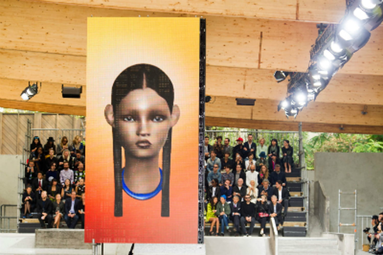 "Kenzo aimerait vous rappeler qu'il n'y a pas de planète B. S'il vous plaît, protégez ce qui est précieux", répétait en plusieurs langues Knola, l'humanoïde virtuel tout droit sorti d'Avatar que l'on pouvait apercevoir sur des écrans géants avant que des images vantant l'écologie ne défilent. Le ton du défilé était d'ores et déjà donné : le futur est de retour, comme on l'a vu plus tôt chez Dior. Et le skatepark aux allures lunaires qui servait de podium s'y prêtait à merveille.