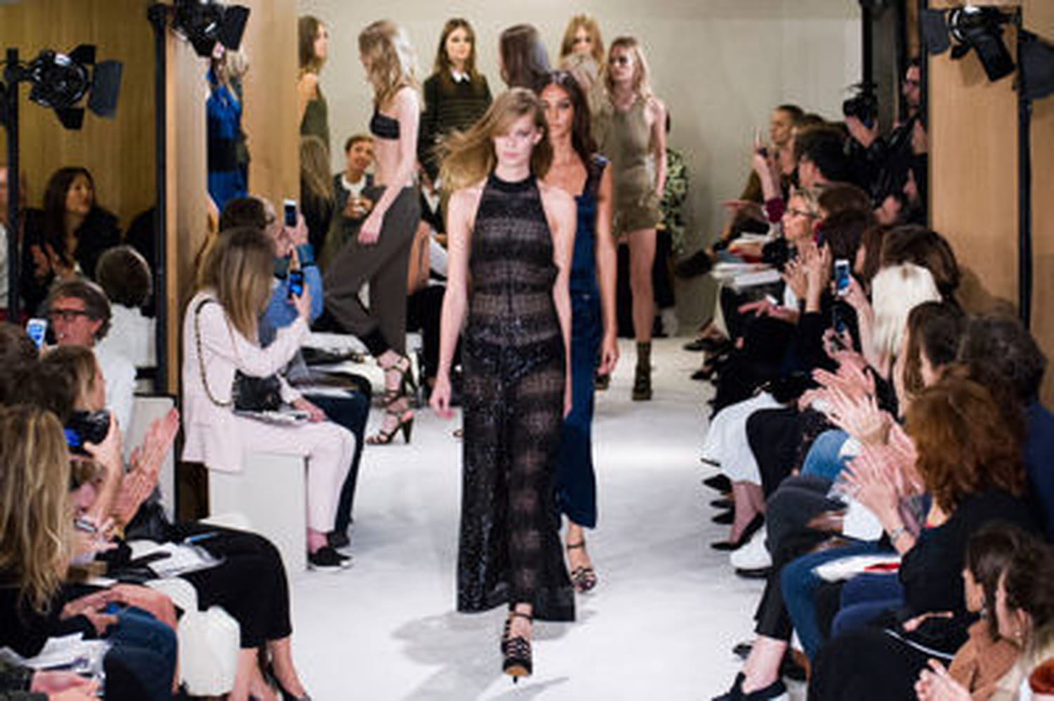 Chez Sonia Rykiel, Julie de Libran révise les classiques de la maison pour sa première collection ou plutôt réinterprète LA signature de la créatrice rousse : la rayure. Cette dernière se décline de multiples façons. Elle s'impose, tel un fil conducteur, tout au long de la collection, portée par la crème des mannequins du moment, des filles Jagger (Georgia May et Lizzy) à Joan Smalls et Kendall Jenner en passant par l'incontournable Miranda Kerr. La nouvelle ligne n'échappe pas aux grandes tendances qui semblent se dégager pour le printemps-été 2015 : de l'esprit army-chic à l'influence seventies en passant par le style croisière. Mais revenons à nos moutons, ou plutôt nos rayures qui s'impriment en détail majeur sur une veste en tweed ou se démultiplient sur une marinière ou une veste sans manche. Elle nous joue même la carte de l'originalité en venant twister des franges et des volants. Bref, elle est partout et vient apporter un côté résolument graphique à l'ensemble des modèles. On craquera forcément pour le mini-tailleur short dont la veste à manches effet cape se porte sur un crop-top aux bretelles croisées sur le décolleté. Même les accessoires se font rayés, des sandales façons méduses précieuses aux chaussettes déclinées en marinière en passant par le sac à main qui s'adopte en cuir lisse ou en version à sequins. Le tailleur-pantalon adopte évidemment la rayure tennis quand les robes du soir accumulent les volants dans un jeu de transparence. La fourrure s'invite en touche et vient habiller les combinaisons et les néo-salopettes qui se portent à fleur de peau. Avec ses beautées rayées, Julie de Libran semble avoir réussi à inscrire l'héritage de Sonia Rykiel dans une première collection plus que prometteuse.