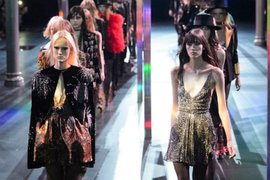 C'est sur fond de sculpture monumentale, composée de barres métalliques angulaires et sur lesquelles venaient se poser quelques rayons lumineux colorés que s'est ouvert le défilé Saint Laurent, l'un des plus attendus en cette fashion week parisienne. Si cette collection ressemble en certains points à celle de la saison passée, la femme Saint Laurent s'autorise davantage la couleur pour le printemps. La longueur mini résiste et s'impose même sur le podium en short, en jupe ou en robe, alors que les pantalons se font plutôt discrets. Le lamé, déjà vu chez la griffe pour l'automne-hiver 2014, s'invite de nouveau et pare ces robes dorées aux allures disco qui scintillent de mille feux. Ce sont d'ailleurs ces années-là qui ont inspiré Hedi Slimane, du milieu des années 60 à la fin des années 70 et plus particulièrement ces jeunes groupies américaines qui ont servi de muses à tant de musiciens. Cols V profonds à profusion, petites pièces preppy comme la veste de pom pom girl arborée par Cara Delevingne... Autant de pièces qui évoquent ces célèbres fans. Aussi, pour conserver l'esprit rock qui émane d'elles, outres les étoiles punk que l'on peut retrouver çà et là, le cuir domine la plupart des pièces : on le retrouve aussi bien en trench, en blouson ou en jupe qu'en combinaison. Ce qui ne nous empêche pas de trouver également des shorts et des minijupes en jean naïfs. Cependant, les imprimés viennent apporter une touche de glamour dans cette ardeur rock and roll, notamment avec ces motifs floraux omniprésents qui s'épanouissent sur les petites robes. Mais l'esprit sauvage reprend vite le dessus et les imprimés animaliers s'invitent à leur tour. Mais ce qui frappe dans ce défilé, c'est ce foisonnement d'accessoires qui habille les mannequins. Si on n'y trouve aucun sac, on peut toutefois découvrir une multitude de chapeaux colorés, de ceintures, de fines écharpes imprimées et surtout, de turbans dignes de la créatrice de bijoux Loulou de la Falaise, défunte muse de feu Yves Saint Laurent. De quoi faire sourire Betty Catroux, fidèle amie des deux créateurs disparus, venue s'asseoir au premier rang du défilé.