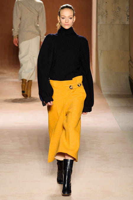 Les robes, tout comme les tops, se portent sans manches et prennent une allure workwear. Décolletées ou à col cheminée, les premières qui défilent sont travaillées dans des matières fluides qui épousent les mouvements du corps. Les autres sont plus structurées : coutures apparentes et côtés ajourés pour certaines ; jeux de volumes et de textures pour les autres. Et pour les habiller, seuls quelques gros boutons vintage suffisent ; chez Victoria Beckham, point de fioriture. Par ailleurs, on retrouve ces derniers sur les manteaux que la créatrice anglaise a conçus. Oversize ou cintrés, lesdits manteaux redessinent la silhouette de manière à l’avantager. On retrouve également des pulls col roulés XXL en maille côtelée très bien coupés, mais aussi des jupe-culottes ultra-chic et des jupes longues fendues.