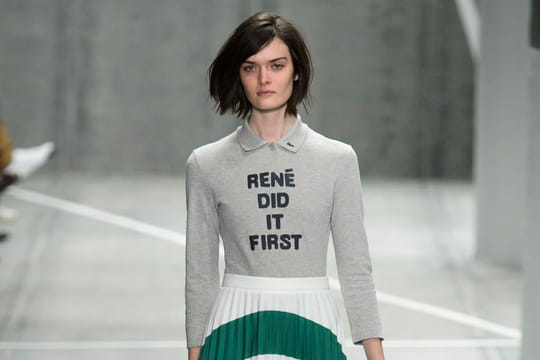 Lacoste nous a épaté lors de son défilé new-yorkais automne-hiver 2015-2016 par un côté très novateur dans ses créations (imprimés géométriques, sweat façon cape, etc.) mais aussi moult petits clins d’œil, plus ou moins explicites, au sport et à l’histoire de la marque. Ainsi, un grand nombre de mannequins défilaient en jogging sophistiqués mais aussi très rétro années 70-80 dans une ambiance sportswear. Certains d’entre eux portaient même des bandeaux de sport sur le front, beaucoup avaient des tennis blanches aux pieds, et on a même retrouvé la petite jupette plissée si sexy qui s’est exportée des courts jusqu’au podium. Côté évocations de la marque et de son domaine de prédilection, Lacoste a également misé sur un stratagème humoristique très en vogue depuis quelques temps : le vêtement à message. On pouvait ainsi lire sur diverses pièces du défilé «René did it first» (en hommage à René Lacoste), «Tennis Anyone ?», «René», «Gazon» ou encore «Terrain dur». On a adoré la palette chromatique très fraîche, voire presque acidulée, pour une collection pourtant hivernale, mais aussi la présence de pièces tendance telles que le manteau long sans manches, la cape, le combo pantalon à pinces/baskets, les chaussures derbies et la combinaison pantalon. Bravo le croco !