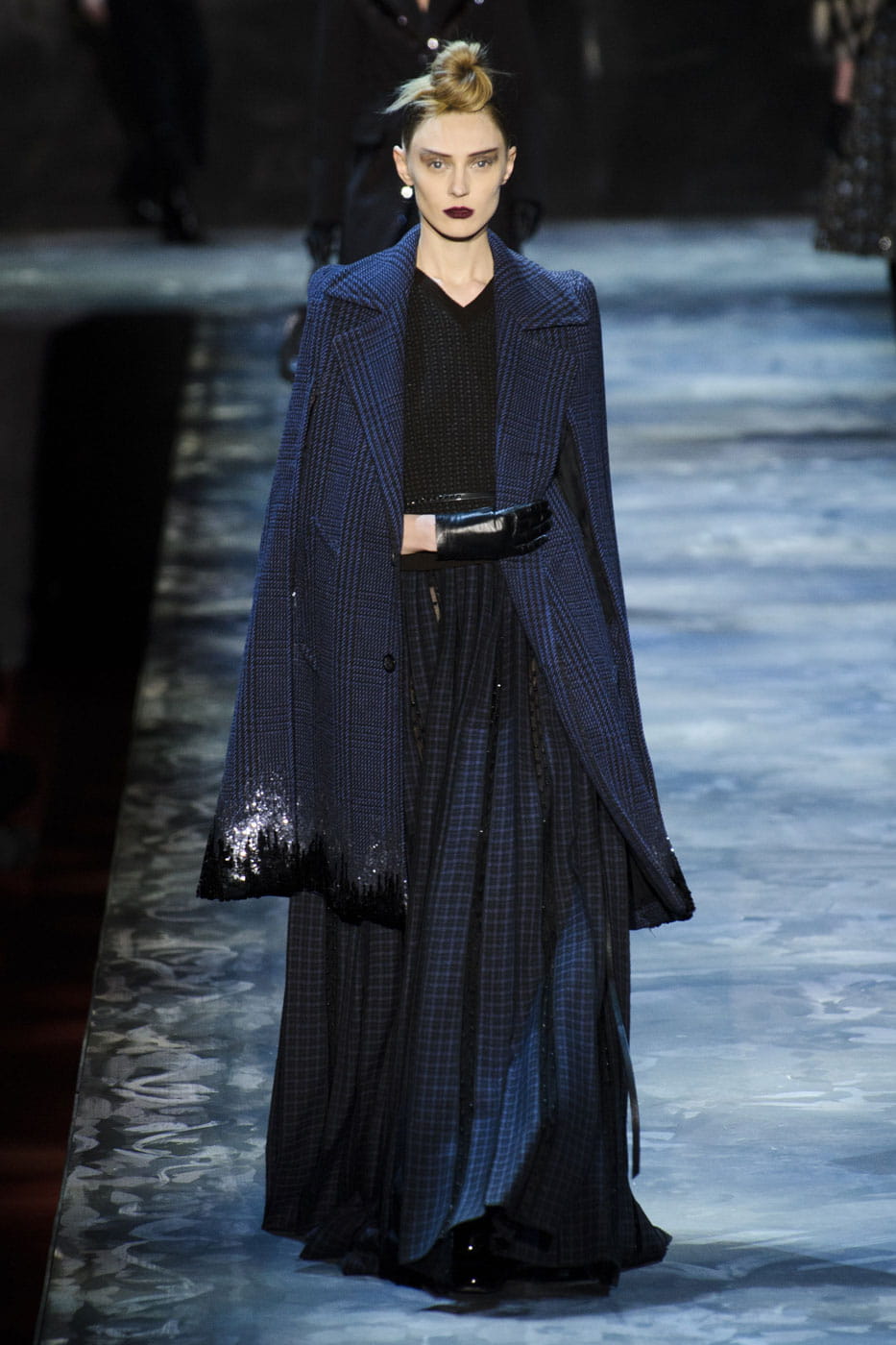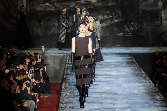 On retrouve dans une palette de couleur sombre des pièces rétro tout droit sorties de l’époque édouardienne, telles que ces longues jupes plissées, associées à des manteaux plus ou moins longs. De nombreux imprimés habillent les vêtements : on va du vichy au tartan british, en passant par le léopard, le chevron et le pied-de-poule. Et surtout, on s’autorise à les mixer entre eux pour produire le plus grand effet. Les gants, longs ou pas, féminisent du bout des doigts les silhouettes avec élégance. La fourrure excentrique, qui avait fait son entrée durant l’automne dernier, semble résister cet hiver chez Marc Jacobs. Aussi, de magnifiques robes longues de soirée années 20, sublimées par de précieux ornements, ont clôturé le show et la fashion week new-yorkaise avec brio.