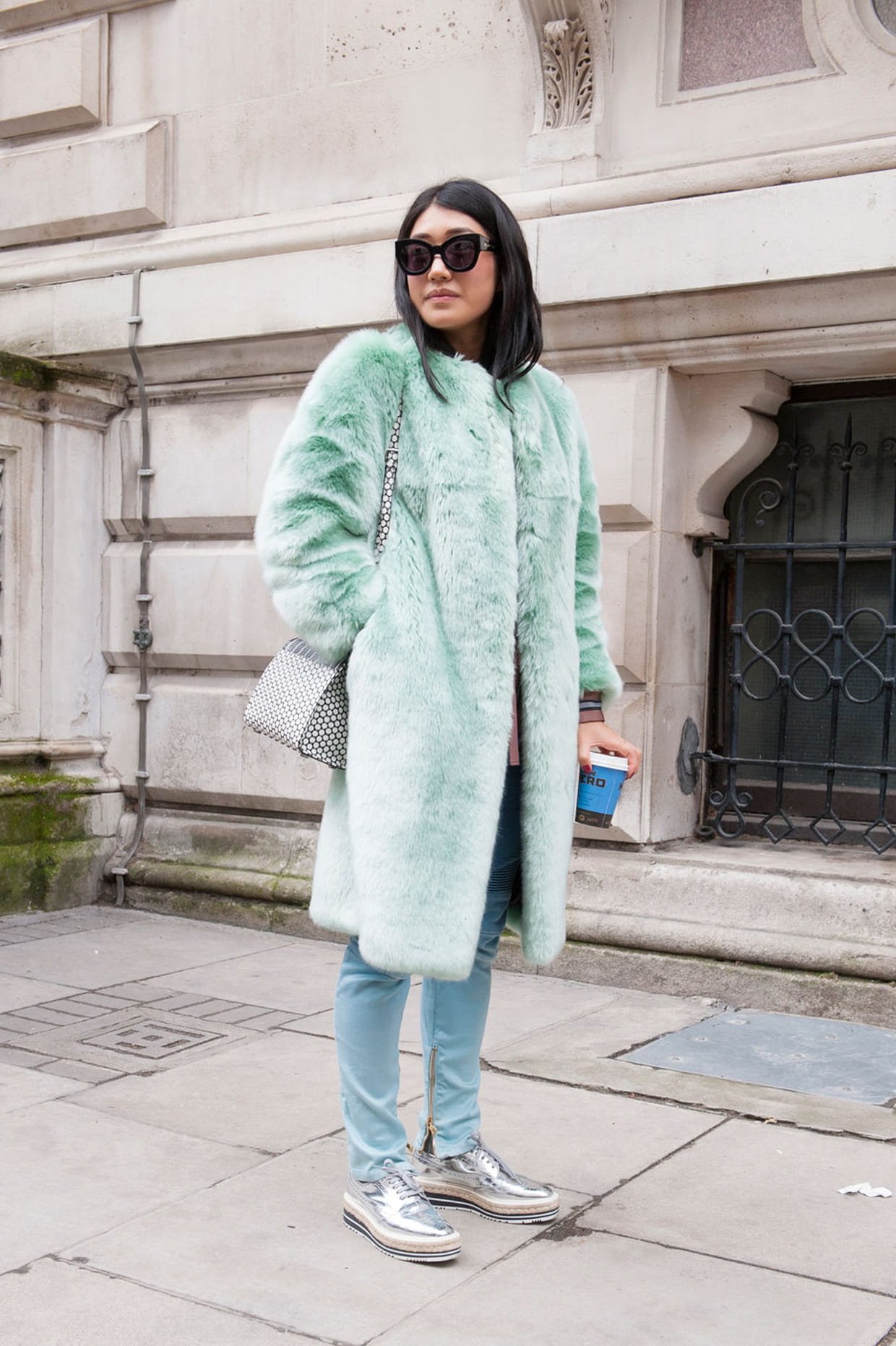 Street style à Londres : la fourrure vert d'eau