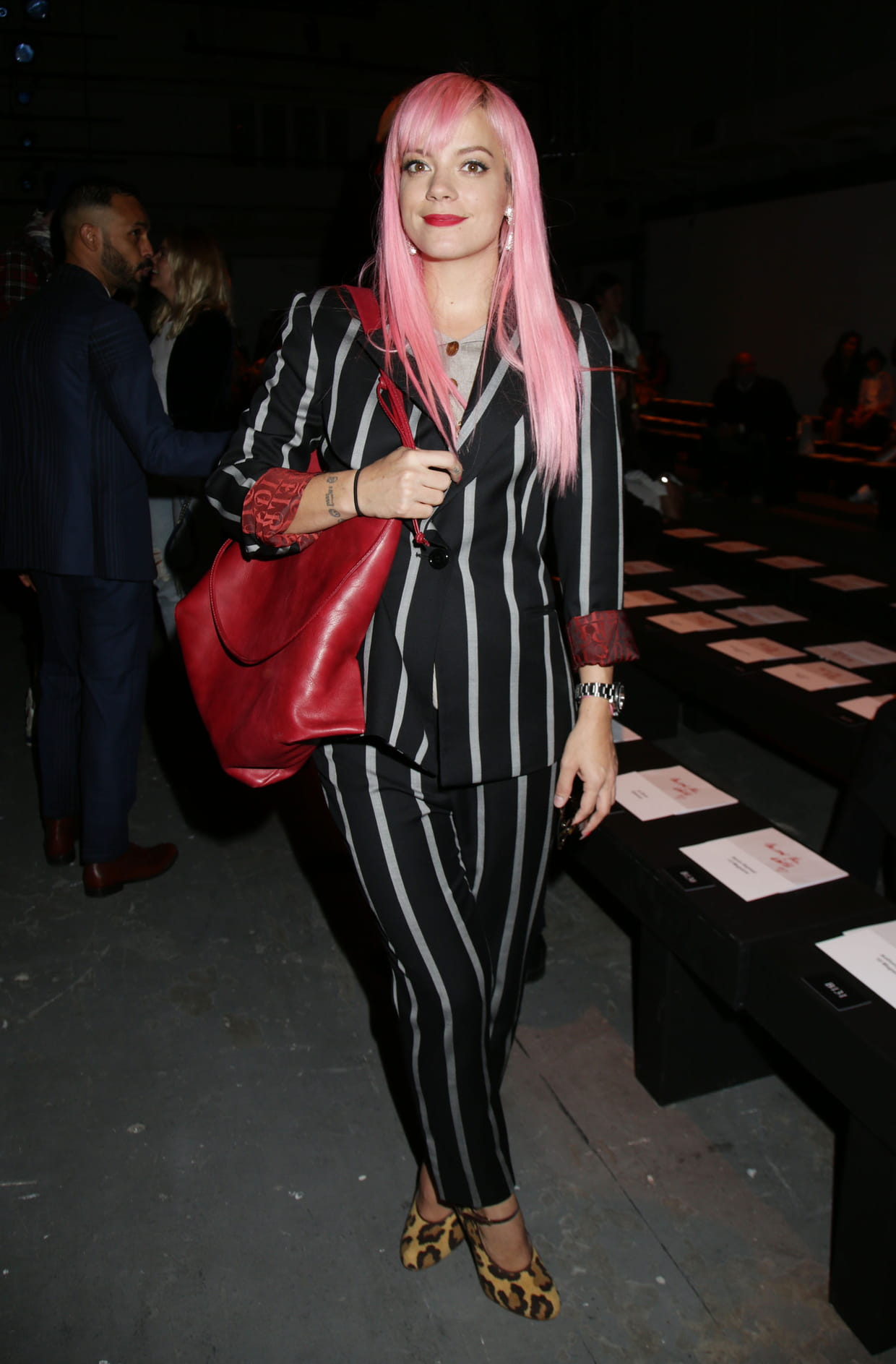 La chanteuse britannique Lily Allen a été aperçue au premier rang du défilé Vivienne Westwood Red Label, dans un tailleur pantalon noir, orné de grandes rayures blanches.