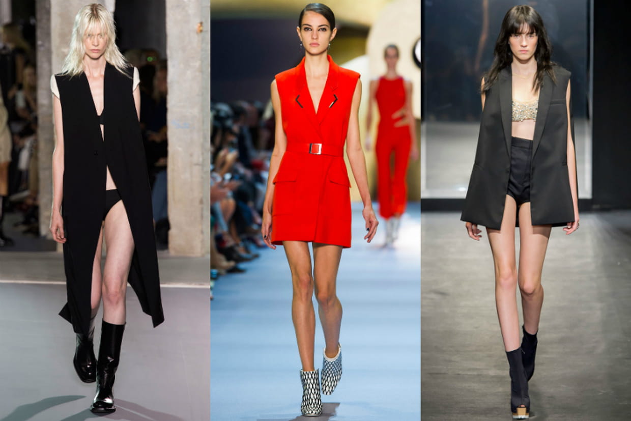 Grande tendance du printemps-été 2015, le blazer sans manches s'offre une prolongation pour l'été prochain. S'il arrive à mi-cuisse (et pas ras la culotte !), on peut le ceinturer comme sur le podium de Thierry Mugler et le porter comme une mini robe workwear.