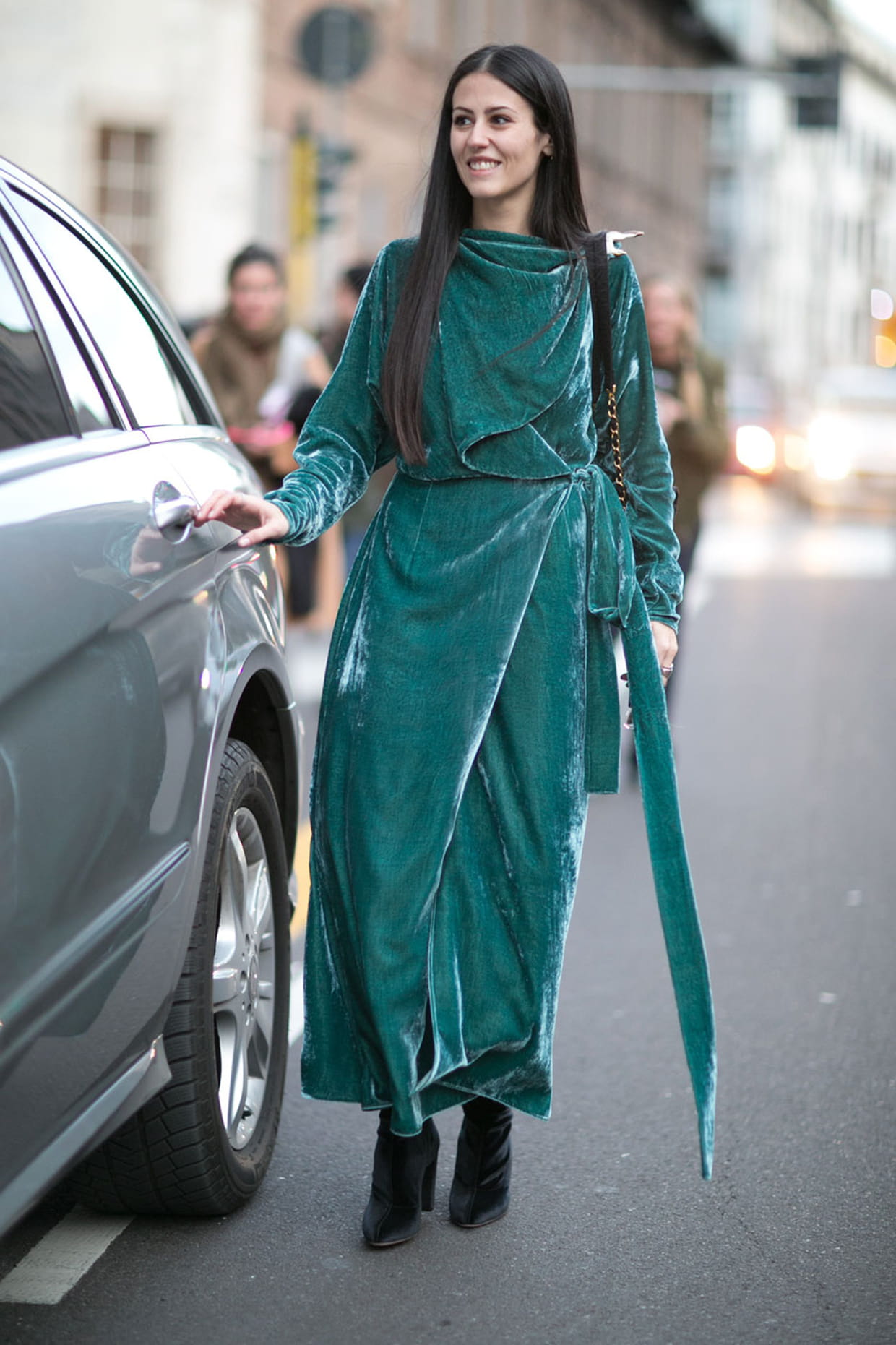 Le velours drapé à la sortie des défilés prêt-à-porter automne-hiver 2016-2017 de Milan