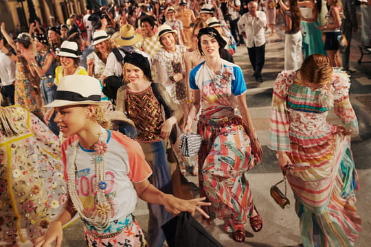 Stella Tennant, allure froide, élégance d'antan et androgynie effrontée, pose le décor en ouvrant le show. Le noir et blanc et de mise pour cette immersion en douceur qui se régale des codes de l'élégance années 50, vestes et chemises, pantalon à pinces amples et panama soulignant un regard mystérieux. Rapidement, la féminité reprends le dessus dans des pans de tulle volatile et des chemisiers et jupes en transparence. Palmes et autres feuillages annoncent un nouveau virage plus organique, dans des matières tissées, aux tons nature et aux silhouettes contemporaines. La femme Chanel à Cuba évolue avec le temps et s'illumine en couleurs. Bientôt, les références à la charmante désuétude du lieu se multiplient. T-shirts imprimés de réclames passées, motifs voitures américaines cubaines, jeans délavés et cuirs usés dessinent un vestiaire douceâtre aux accents pop. L'homme, très présent lors du show, la joue aussi chic ou urbain, classique ou contemporain. Mais il laisse place au final à la féminité sophistiquée de Chanel version Karl Lagerfeld, dans un bouquet de petites robes colorées précieuses qui font son succès. Une croisière dans le temps et sous le soleil pour laquelle on embarque volontiers.