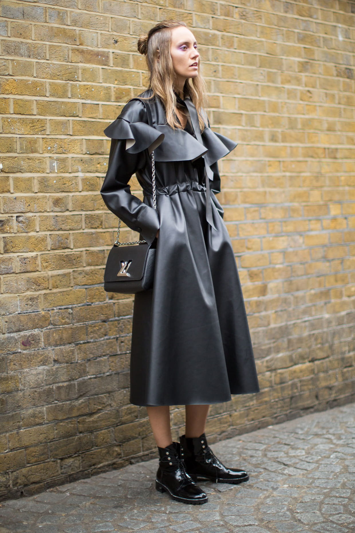 La robe cuir travaillée à la sortie des défilés prêt-à-porter printemps-été 2017 de Londres