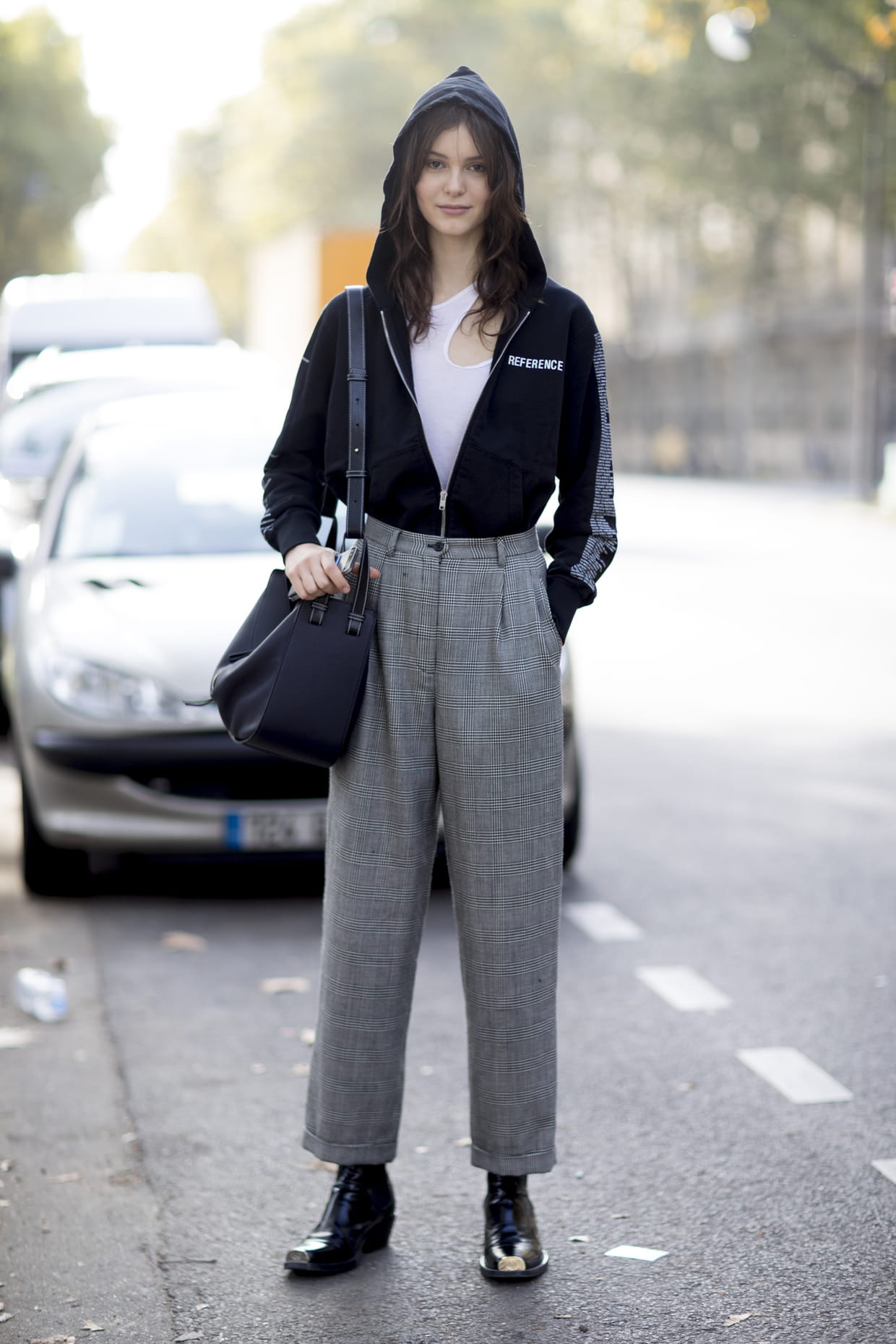 Le combo pantalon taille haute et hoodie repéré aux abords des défilés printemps-été 2018 lors de la fashion week de Paris