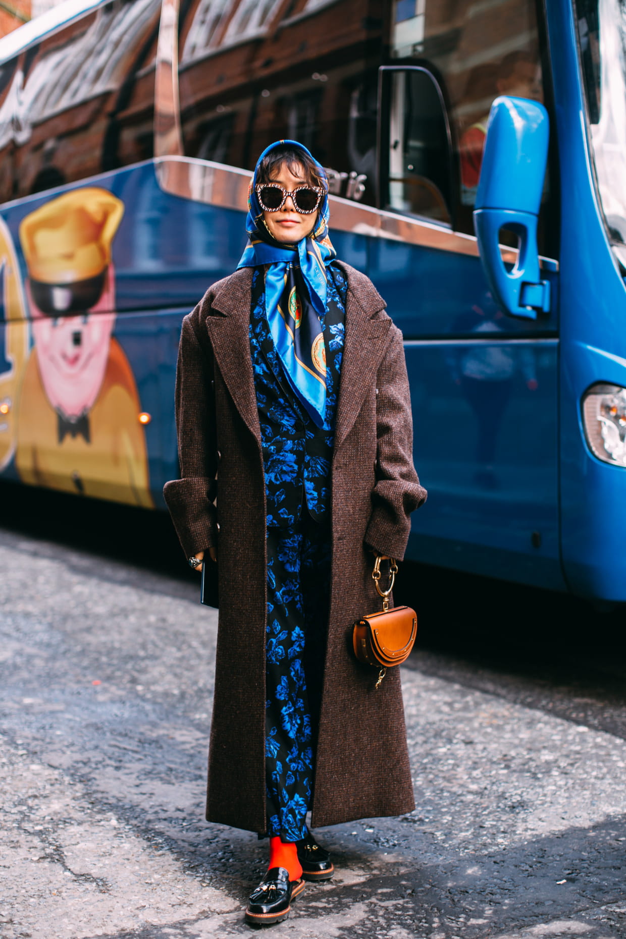 Le fichu sur la tête à la sortie des défilés automne-hiver 2018-2019 à Londres