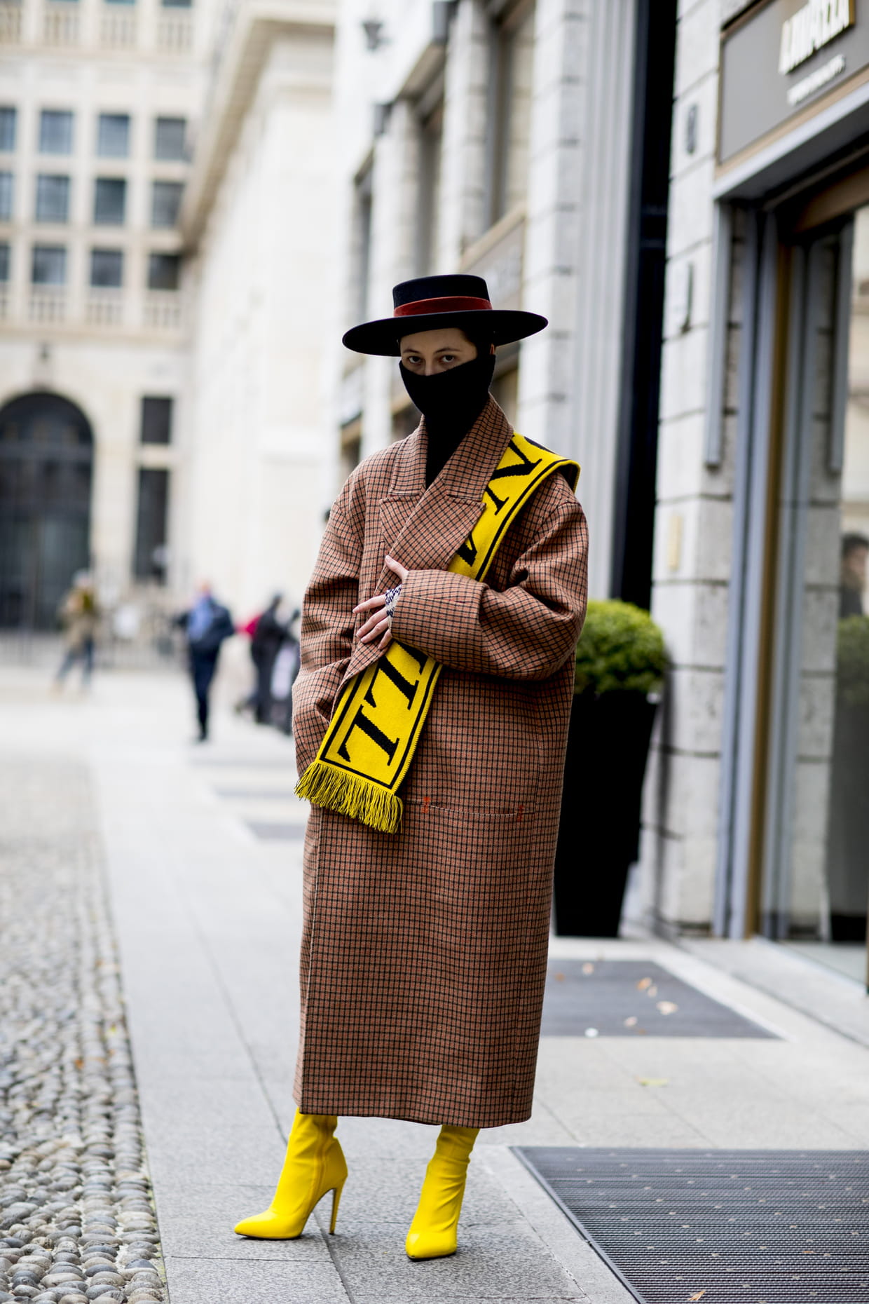 L'écharpe portée épaule  à la sortie des défilés automne-hiver 2018-2019 à Milan