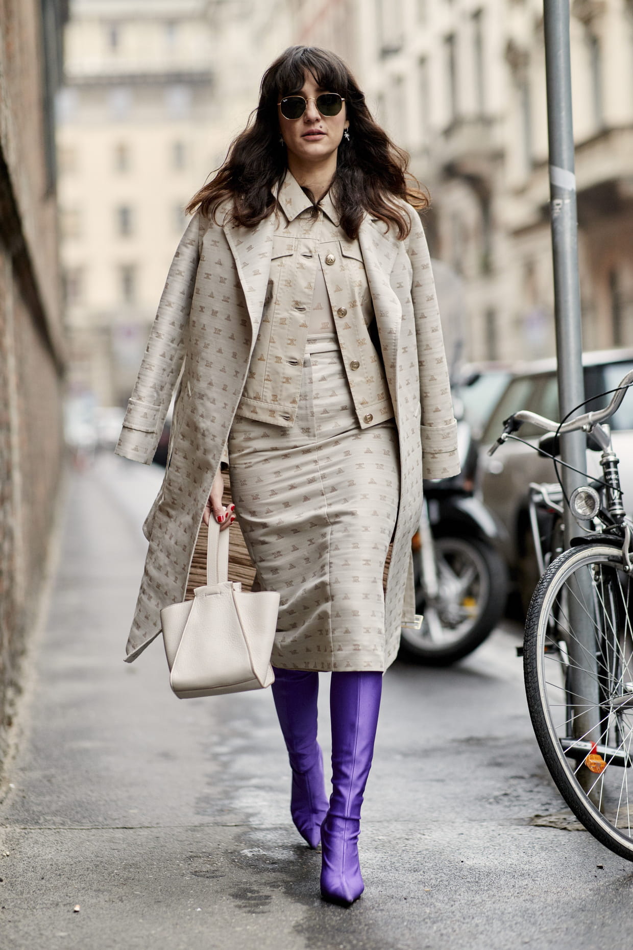 Les bottes ultra violet à la sortie des défilés automne-hiver 2018-2019 à Milan