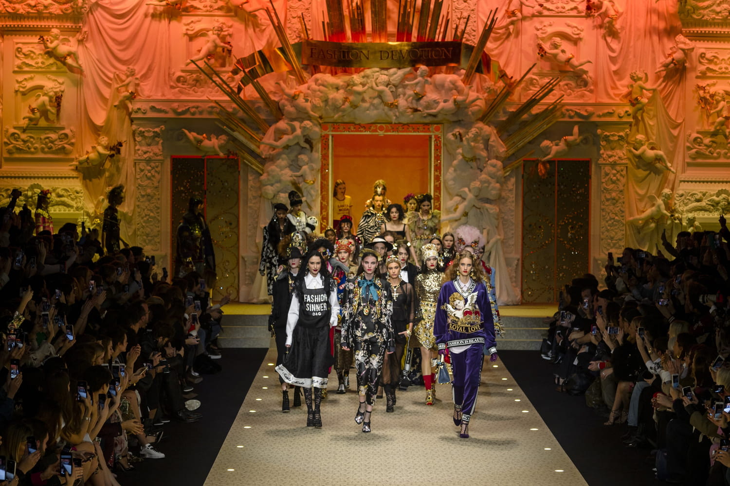 En un seul weekend, le duo italien aura proposé en tout et pour tout trois défilés. Le premier, ayant eu lieu le samedi 24 février, était composé de robes de soirée présentées sur le catwalk par une armée de 48 jeunes aristocrates du monde entier devenues mannequin d'un soir. Le deuxième défilé était celui qui présentait la collection FW18-19 officielle, inspirée par la religion. Enfin, le troisième, reposant sur le principe du "see now, buy now", avait lieu dans un grand concept store milanais et mettait en avant 33 pièces ensoleillées et féminines pour le printemps-été 2018. Une capsule mise en vente au moment-même du final du show dans les escalators du magasin.