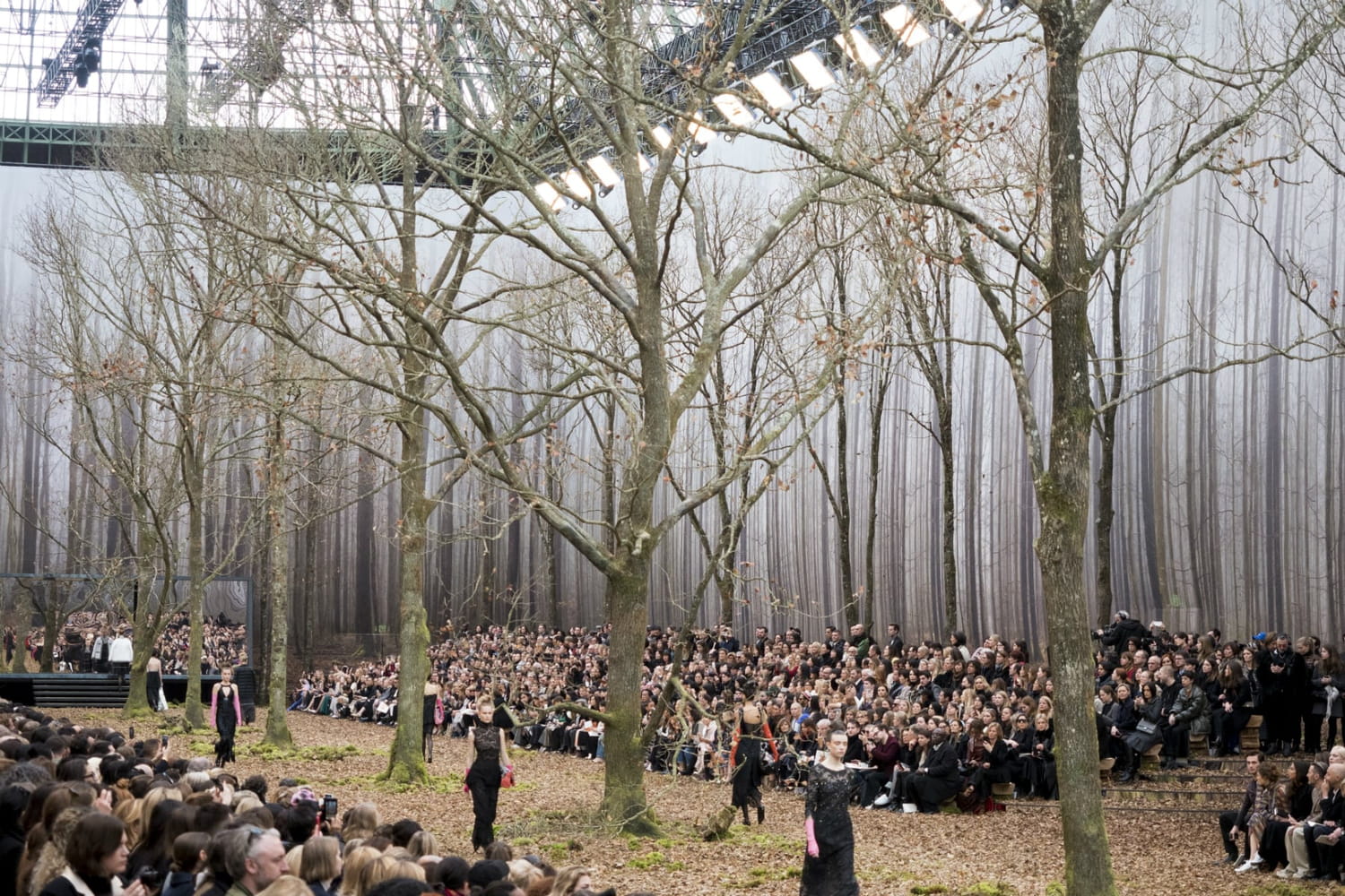 L'automne s'est invité en plein mois de mars rien que pour Chanel. Arbres, mousse et parterre de feuilles mortes ont été amenés du parc du Perche - et y seront rapportés après le show - pour transformer la nef du Grand Palais en forêt brumeuse. Ainsi, la femme Chanel traverse avec élégance ce bois plongé dans une ambiance romantique, voire mélancolique, en total accord avec l'esprit de la collection automne-hiver 2018-2019.