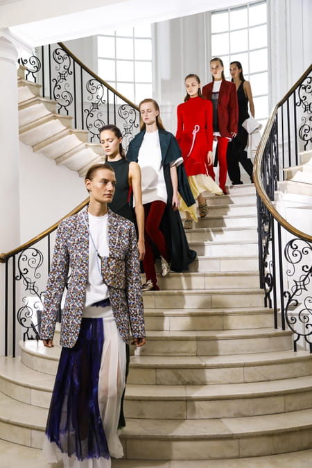 D'autres nouveautés s'invitent également sur le podium de la styliste. On remarque un clin d'œil évident à ses origines anglaises avec la présence d'un imprimé fleuri Liberty parfaitement bien intégré. Les fines rayures verticales bicolores aussi sont de la partie pour apporter un peu de fantaisie à la palette chromatique assez basique que l'on voit habituellement au sein des collections VB. Côté coupes, on repère le retour du col cheminé, les élégantes robes longues se font fluides et vaporeuses – idéales pour fouler un red carpet de cérémonie -, les jupes midi et 7/8èmes sont toutes aussi légères mais aussi asymétriques. Pour ce qui est des pièces fortes, on retient le pantalon skinny très (trop) long, fendu sur le devant pour tomber sur la chaussure et l'épouser, les vêtements trompe-l'œil façon pull noué sur les épaules où fausses manches se multiplient, et les accessoires, toujours très réussis. Pour l'été prochain, l'anglaise nous propose des sacs mous XXL à porter sous le bras nonchalamment et des boots plates, déclinées en cuir blanc, noir et même métallisé doré. Mais c'est la superposition omniprésente qui retiendra le plus notre attention sur ce défilé très réussi. Accumulation de robe sur top, de jupe sur pantalon, de débardeur sur débardeur ou encore de haut tablier asymétrique sur t-shirt… les vêtements se combinent et se cumulent pour créer de nouvelles pièces hybrides, complexifier les silhouettes et coloré l'ensemble.