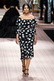 C'est au son des cloches d’église et celui des pas fantomatiques d'innombrables silhouettes féminines vêtues de noir que s'est ouvert le défilé Dolce & Gabbana printemps-été 2019, introduisant ainsi un premier clin d’œil à l'univers catholique cher à la maison. Les mannequins figés telles des statues - partie intégrante du décor - ont pris vie un à un sur le catwalk, rythmant ainsi le défilé, Chacun d'eux arboraient ostensiblement les codes la griffe avec des couronnes de fleurs, des bijoux pleins de dorures et de pierres multicolores ou encore des diadèmes. C'est sur le fameux opéra italien "Largo al factotum" que la belle actrice Monica Bellucci a ouvert le bal dans une robe noire à pois blancs, sculptante et volantée ambiance dolce vita, dévoilant une collection inspirée de l'héritage italien des deux créateurs.