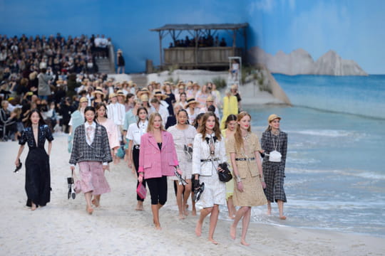 Transporter le bord de mer dans le Grand Palais à Paris ? Il n'y a qu'à demander ! Après y avoir amené une forêt, la banquise, la rue Cambon ou encore un aéroport, rien de plus facile pour Karl Lagerfeld que d'y acheminer une plage de sable fin pour le défilé Chanel. Barrières en bois flotté, cabanon, chaises de surveillance, dunes de sable et, bien entendu, écume de mer : tout était là pour parfaire ce beau simulacre. C'est donc une projection idyllique de l'été 2019 que le directeur artistique a offert à ses invités qui se sont évadés en regardant des mannequins déambuler les pieds dans l'eau, chaussures à la main, en tenue des plus élégantes.