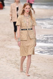 Le tailleur prend des allures de ciré, la petite veste devient tour à tour paletot et blazer boyish, la jupe se la joue jupe-culotte et le tweed, omniprésent, prend mille et une formes. Il s'assouplit et s'affine considérablement pour plus de fraîcheur et de confort pendant la saison chaude, mais surtout pour se moderniser indéniablement. On le retrouve sur des ensembles assez classiques mais aussi sur un sublime caftan très frais esprit sortie de bain ou encore sur une petite robe boutonnée motif pois à fines bretelles, Ses couleurs sont douces avec une palette faite en grande partie de rose clair, bleu ciel, lilas, jaune pâle, crème et blanc. Chanel semble avoir enfin réussi à donner une nouvelle jeunesse au tweed : victoire !