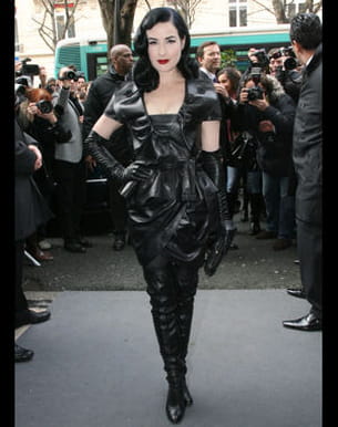 La célèbre effeuilleuse burlesque ne rate jamais un défilé de la maison. C'est tout en cuir qu'elle est venue assister à la présentation de la collection haute couture prientemps-été 2010.