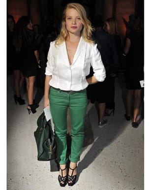 Rien de surprenant à retrouver l'égérie du parfum "Belle d'Opium" au défilé de la maison Yves Saint Laurent. La jolie blonde a pour l'occasion adopté un look simple qui ne manque pas de style. Mélanie Thierry, pourtant comédienne, n'a pas peur de porter du vert. Elle ose le pantalon color block et joue les rappels avec un it-bag émeraude. Pour accompagner cette jolie couleur, l'actrice mise sur la sobriété efficace d'une chemisier blanc. Elle a également choisi des sandales à plate-forme qui font gagner quelques centimètres à ce petit bout de femme d'1m58 !