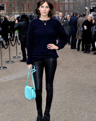 Cet ex-top anglais a gardé de ses années de mannequinat sa silhouette filiforme qui lui permet tous les styles. Elle nous le prouve au défilé Burberry Prorsum automne-hiver 2011-2012, toute de Burberry vêtue (of course !), lors de la fashion week londonienne. Pour le haut, la parfaite Alexa Chung a opté pour un gros pull en laine afin d'affronter dignement l'éternelle grisaille anglaise ! Mis en valeur par ses jambes interminables, le tregging a encore de beaux jours devant lui. Sur cette tenue sobre, elle a apporté sa petite touche fashion : un sac en bandoulière d'un beau bleu turquoise qu'elle porte à la main. Une couleur parfaite et tendance pour réveiller avec fraîcheur sa tenue.