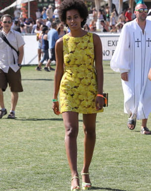 Chaque année, le festival de musique de Coachella fait la part belle aux musiciens, célébrités et autres modeuses, toujours plus nombreux à rivaliser d'originalité avec des looks soignés. Là-bas, la tendance hippie surplombe toutes les autres, mais certains ont tenté de se diversifier cette année à l'image de la jolie Solange Knowles. Si on la connait plus pour ses liens de fraternité avec la célèbre chanteuse américaine Beyoncé, on sait aussi qu'elle est une véritable modeuse. Alors quand elle prend la pause pour les photographes, le moins que l'on puisse dire c'est qu'elle ne passe pas inaperçue. Pimpante dans sa robe jaune imprimée citrons à sandales assorties, elle est tout simplement radieuse. Il faut dire qu'à chacune de ses apparitions la belle fait sensation. Rien d'étonnant quand on sait à quel point elle déborde d'imagination. On a hâte de découvrir son prochain look !