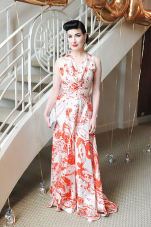 Dita Von Teese nous prouve une fois de plus son goût certain en matière de mode. Moins rétro (si ce n'est sa coiffure) mais plus arty qu'à son habitude, la star maîtrise à la perfection l'art des tenues qui en jettent. Ici, sa longue robe à l'imprimé blanc et orange se révèle parfaite pour la saison. A la fois estivale et très élégante par sa longueur, elle se fait bohème très chic. La célèbre effeuilleuse mise sur une pochette d'un blanc nacré et des bijoux précieux pour assurer une sophistication certaine à son look. On note aussi l'accord parfait entre son rouge à lèvres et le coloris de sa robe. De quoi séduire la rédaction !