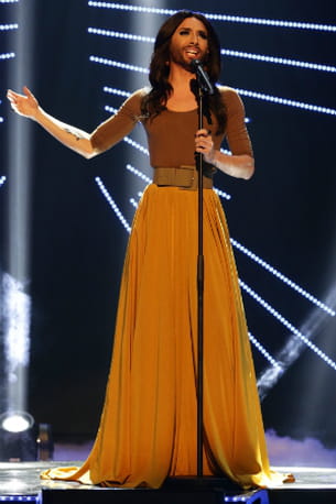Invité au Graham Norton Show à Londres, le gagnant de l'Eurovision a interprété ses chansons dans une tenue aussi lumineuse que sa voix. Habillé d'un top brun, il a eu l'idée ingénieuse de souligner sa taille fine avec une ceinture taille haute couleur bronze et d'accorder le tout à une longue jupe moutarde à traîne. On raffole de ce dégradé de teintes aux couleurs chaleureuses qui éclaire le teint basané du chanteur. Côté make-up, Conchita laisse sa longue chevelure brune onduler sur ses épaules et accentue son regard grâce à un mascara noir très marqué. L'ensemble de ce superbe look fait de lui l'une des personnes les mieux habillées de cette fin d'année : chapeau bas !