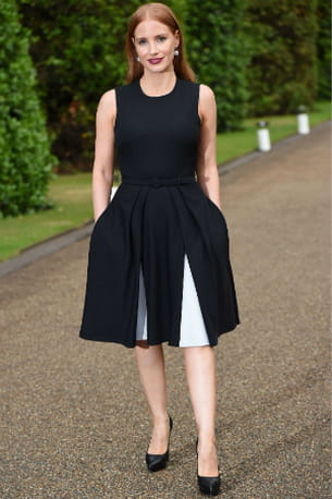 L'Américaine Jessica Chastain a apporté un vent de glamour hollywoodien à Londres ce 22 juin, lors du cocktail organisé par Vogue et Ralph Lauren. La flamboyante rousse a rendu hommage au styliste mis à l'honneur ce soir là : elle s'est pour l'occasion vêtue d'une robe noire Ralph Lauren Collection sans manches, marquée à la taille par une ceinture en trompe l'œil. Sa particularité ? Son jupon plissé qui dévoilait, telles des fentes, des pans de tissus immaculés. Pour l'accessoiriser, l'actrice s'est chaussée d'escarpins à talon hauts. Côté bijoux, des pendants en forme de fleurs venaient mettre en valeur ses oreilles, qui retenaient sa chevelure rousse. Celle qui a remporté un Golden Globes pour sa prestation dans Zero Dark Thirty a visiblement tout d'une vedette d'Hollywood.