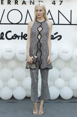 Dans la famille Delevingne, on demande la grande sœur. Bien moins mise en avant que Cara, Poppy a tout de même conquis le monde de la couture dans son rôle de mannequin et reste une mondaine très prisée des radars mode. Pour preuve, la firme espagnole de grands magasins El Corte Inglés a choisi la britannique comme marraine de sa nouvelle boutique Serrano 47 Woman. À l'occasion de son ouverture, la jeune femme avait opté pour une tenue originale signée par le brillant Giambattista Valli. Fait entièrement de broderies argentées, l'ensemble fait dialoguer un gilet-tunique sans manches à un pantalon taille haute évasé. Si les jolies bordures noires ondulées révèlent subtilement le buste de la belle, la longueur 7/8ème du bas permet de pouvoir contempler ses escarpins dorés.