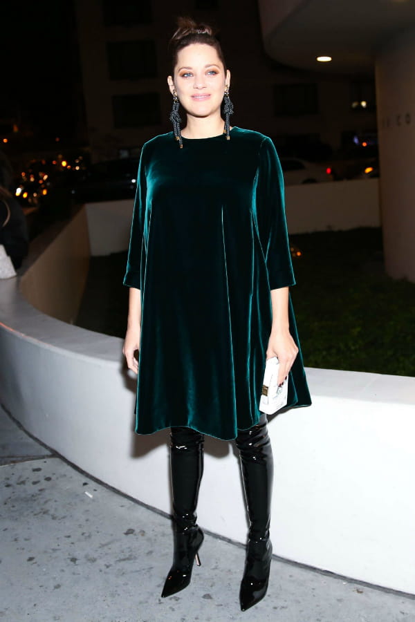 En promo de son dernier film, sous le feu des rumeurs, enceinte, Marion Cotillard fais plus que jamais l'actualité. Sur tous les fronts, l'égérie Christian Dior l'est aussi visiblement dans un registre mode, puisque sa dernière apparition cristallise trois des tendances majeures de cet hiver. Au côté de l'équipe de la maison de couture qui organisait son Gala Guggenheim à New York le 16 novembre, l'actrice française affichait un look hivernal enchanteur. Sobre mais impeccablement tendance, il était composé d'une robe trapèze de velours émeraude, dont la justesse de coupe pour la future maman et de couleur pour la belle brune était absolue. Trois accessoires suffisent à composer cette panoplie parfaite : une paire de cuissardes vernies noires sexy mais adoucie par le velours, une minaudière tarot et une paire de maxi boucles d'oreilles en cordage. En somme, le dress code idéal de notre hiver.