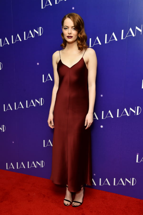 C'est le phénomène cinématographique de cette nouvelle année. La La Land, véritable hommage aux comédies musicales Hollywoodiennes des années 50, est dors et déjà considéré comme le film qui marquera 2017. Adoubé par la critique, ce long-métrage réalisé par Damien Chazelle collectionne les récompenses et part favoris dans la course aux Oscars. Si cette pépite du grand écran fait chavirer les cœurs du monde entier, son actrice principale suscite la même ferveur grâce aux looks qu'elle arbore aux avant-premières. Et c'est pendant l'une d'entre elles, à Londres, qu'Emma Stones a conquis les foules. Signée The Row - griffe des sœurs Olsen - cette slip dress bordeaux et satinée prouve une fois de plus  que simplicité et élégance font souvent bon ménage. À la fois chic et tendance, la robe rétro se marie à merveille avec les fines sandales Jimmy Choo choisies par la belle. Que ce soit à l'écran ou sur les tapis rouges, Emma Stone sait comment mener la danse !