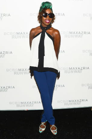 La chanteuse joue la carte du pantalon coloré, assez rare sur les people au premier rang des défilés. Une touche verte dans les cheveux et un top blanc et noir évasé viennent compléter sa tenue pour le défilé BCBG Max Azria. C'est (trop?) audacieux à l'image d'Estelle qui n'a pas peur de se sortir du lot.