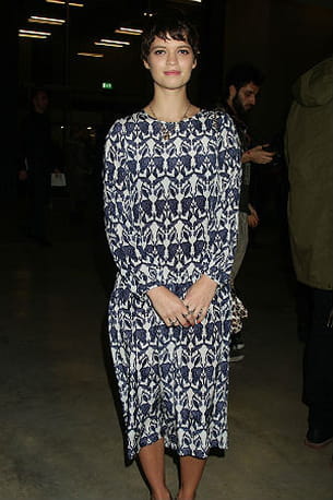 L'Anglaise joue la carte Topshop pour le défilé Unique avec cette robe imprimée. Si on n'est pas forcément fan de la forme, on note le make-up naturel et la petite coup garçonne.