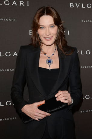 L'ancien top et première dame de France est aujourd'hui la muse de la collection Diva de la maison Bulgari. C'est donc simplement vêtue d'un tailleur-pantalon noir pour mieux mettre en valeur les bijoux précieux que Carla Bruni a posé pour les photographes.