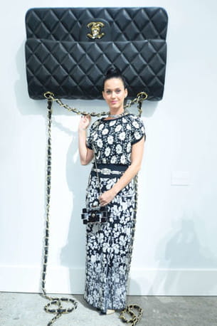 La chanteuse a adoré le décor imaginé par Karl Lagerfeld pour son nouveau défilé prêt-à-porter printemps-été 2014. Katy Perry a posé avec un immense sac matelassé. A côté, sa minaudière paraît presque ridicule. Quand un sac Chanel en éclipse un autre !