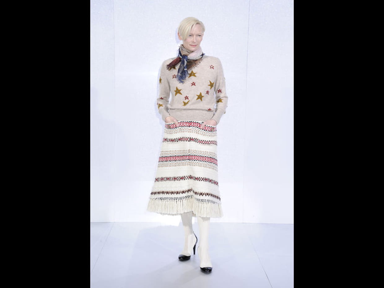 L'actrice anglaise ne craint pas le froid en cette période de défilés haute couture. Avec son pull et sa jupe en maille Chanel, Tilda Swinton contemple les collections printemps-été 2014 en mode très hivernal.