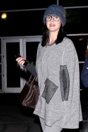 Là, on peut dire que le contraste est flagrant. Certes, la chanteuse cherche sûrement à ne pas être reconnue mais bon le combo pull-cape, gros bonnet et larges lunettes, c'est un peu too-much, non ? "Ugly Katie" est parmi nous.