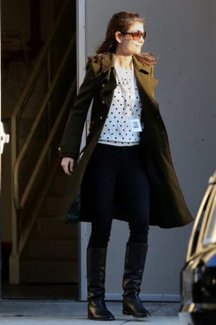 Dans la vie de tous les jours, Katie reste assez fidèle à son style : élégante et tendance. Ici, elle mise sur un manteau esprit officier porté sur un top à pois, un slim et des bottes plates. Pas renversant mais efficace.