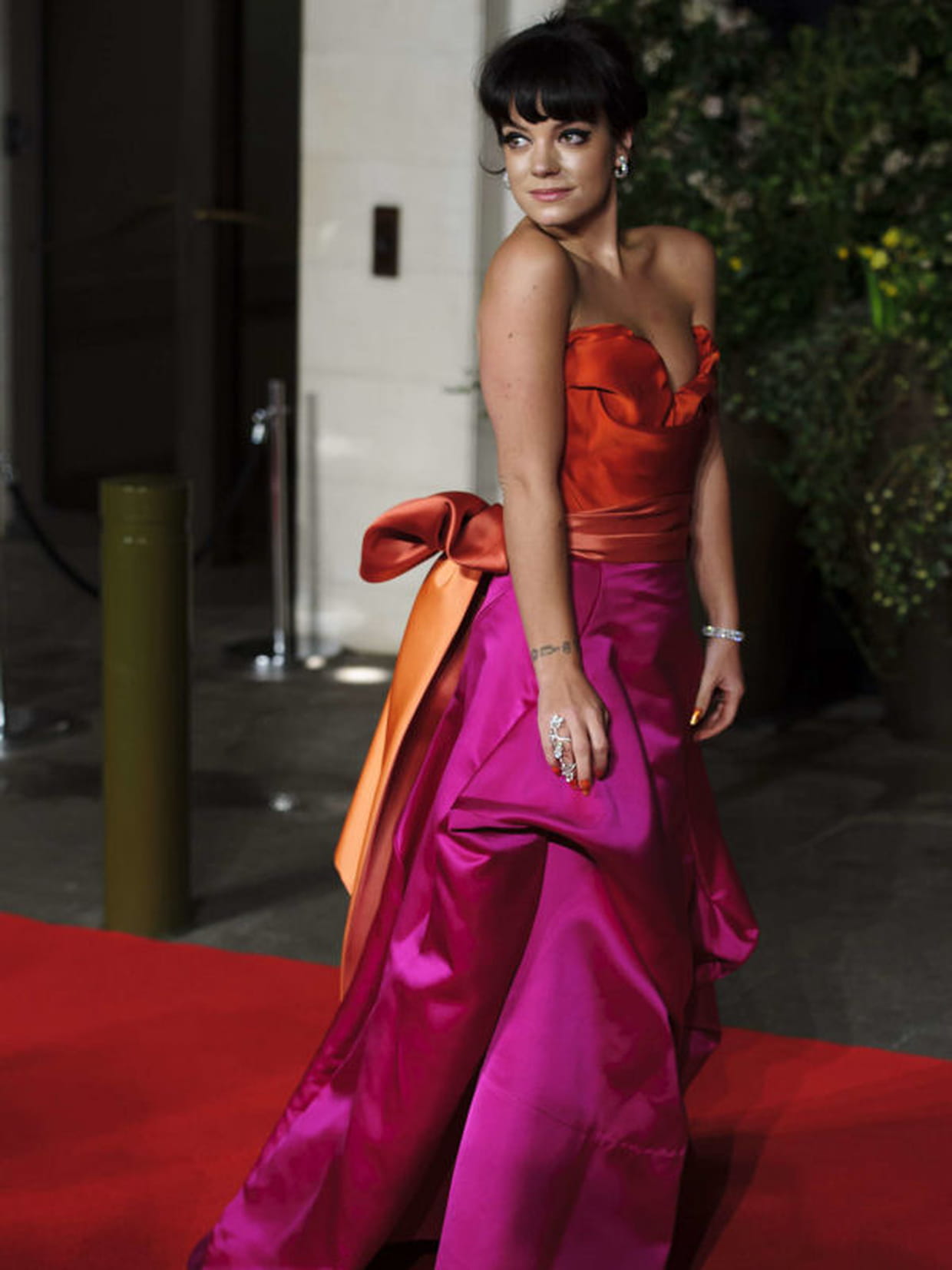 La chanteuse était la reine du bal avec sa robe fuchsia et orange. Du satin, une forme bustier et un gros noeud dans le dos... Autant d'atouts pour Lily Allen qui n'est pas passée inaperçue.