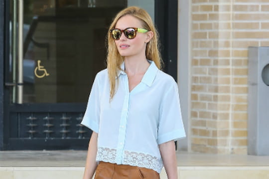 Si lorsque vous sortez, vous ne prêtez guère attention à votre tenue, ce n'est pas le cas de Kate Bosworth ! Repérée (parce que ultra-lookée) en pleine séance shopping dans le le grand magasin Barney's à Los Angeles, la belle sait captiver le regard. A juste titre, l'Américaine de 31 ans portait un chemisier bleu pastel avec un empiècement en dentelle ainsi qu'un short en cuir marron aux accents rétro (une pièce sublime qu'on lui arracherait volontiers !). On se surprend à aimer le mix inattendu du bleu pâle et marron cognac pour un style trendy et vintage tout à fait paradoxal mais fascinant. En pleine séance shopping, Kate associe à sa tenue des mules à talons noires. Si le choix de cette paire laisse à désirer, on lui accorde le bénéfice du confort ! Des lunettes marron à branches fluo habillent le visage de la jeune femme et renforcent cette allure estivale que permet le temps de la Cité des Anges. Enfin, cerise sur la gâteau : le sac en cuir blanc perforé de fleurs, ô combien désirable. Une touche chic qui respire la délicatesse et l'été. A la voir si détendue, on ne dirait pas que des photos d'elle dénudée ont circulé le net, un mois auparavant. Qu'importe, la bave du crapaud n'atteint pas la blonde et lookée colombe !