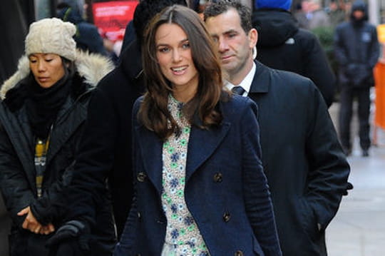 Pour Keira Knightley, la promo du film Imitation Game à New York fut un véritable défilé de mode. La veille, à la première du film, elle portait une robe imprimée Dolce & Gabbana, et dès le lendemain, pour briller sur le live de l'émission matinale Good Morning America, l'actrice remettait ça avec une nouvelle robe à motifs, très printanière cette fois-ci. Malgré les très faibles températures new-yorkaises actuelles, la jeune Anglaise - sans doute gelée mais stylée - a amené un peu de soleil grâce à cette sublime robe gris perle à fleurs de couleur vert d'eau, bleu ciel et bleu marine. Cette dernière joue sur les matières entre de la broderie et du tulle. Une petite merveille sans manche, ras-le-cou et longueur genou qui, avouons-le, n'était cependant pas franchement de saison. Elle est signée Michael Van Der Ham (collection printemps-été 2015). Pour se réchauffer un peu, miss Knightley s'était emmitouflée dans un manteau en laine esprit trench, mi-cheville, d'une couleur bleu nuit et à gros boutons en écaille. Une coupe très ajustée pour cette pièce mode incontournable signée - en fière british que l'actrice est - par la maison Burberry bien sûr. Et pour finir de rappeler les tons de sa robe, la star de Imitation Game portait aux pieds des escarpins en daim vert anglais (patriote jusqu'au bout) d'une grande finesse. En conclusion, même si on grelotte pour elle à la vue de ce look, c'est un sans-faute pour Keira Knightley toujours aussi élégante qu'à son habitude.