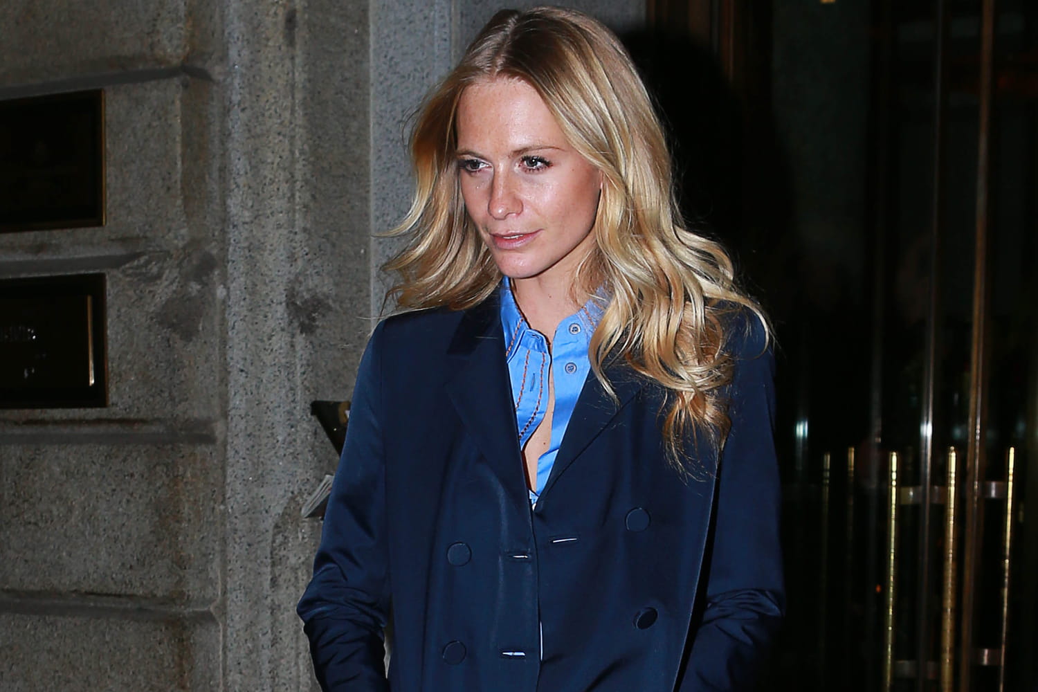 Aux pieds de Poppy Delevingne, des mocassins noirs à talonnette, légèrement brillants et extrêmement chic. Le point fort de la tenue, c’est le trench-coat bleu marine satiné. Il casse la décontraction de la chemise et appuie l’élégance du pantalon et des chaussures.
