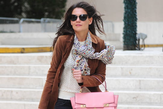 Il fait plutôt froid à New York en ce moment et Katie Holmes s’est habillée en conséquence. L’actrice a enfilé un pull ivoire, avec des chevrons finement découpés. En manteau, elle a choisi de porter un long trench acajou en daim dont la teinte s’accorde généralement plutôt bien avec les cheveux bruns. Pour le bas, l’américaine a opté pour du classique puisqu’elle porte un simple slim noir avec des bottines à talon. Autour de son cou, elle a noué un foulard à motifs qui reprend par petites touches les couleurs de sa tenue et d'autres plus printanières. Ainsi, les teintes sont chaudes, mais Katie Holmes sait comment rafraîchir un look d’hiver…. L’Américaine a reboosté le tout avec un sac rose clair très girly mais finalement assez chic. L’accessoire est griffé Henri Bendel et s’accorde étonnement bien avec l’ensemble. Le petit détail qui nous séduit, en plus de la couleur, c’est la double anse qui est composée de fines lanières. Lorsqu'on possède une pièce forte comme celle-ci, on se doit de la mettre en valeur. Ainsi, la meilleure façon de porter un beau sac est celle de l'ex -femme de Tom Cruise, c'est à dire sur l'avant-bras pour que tout le monde puisse le voir.